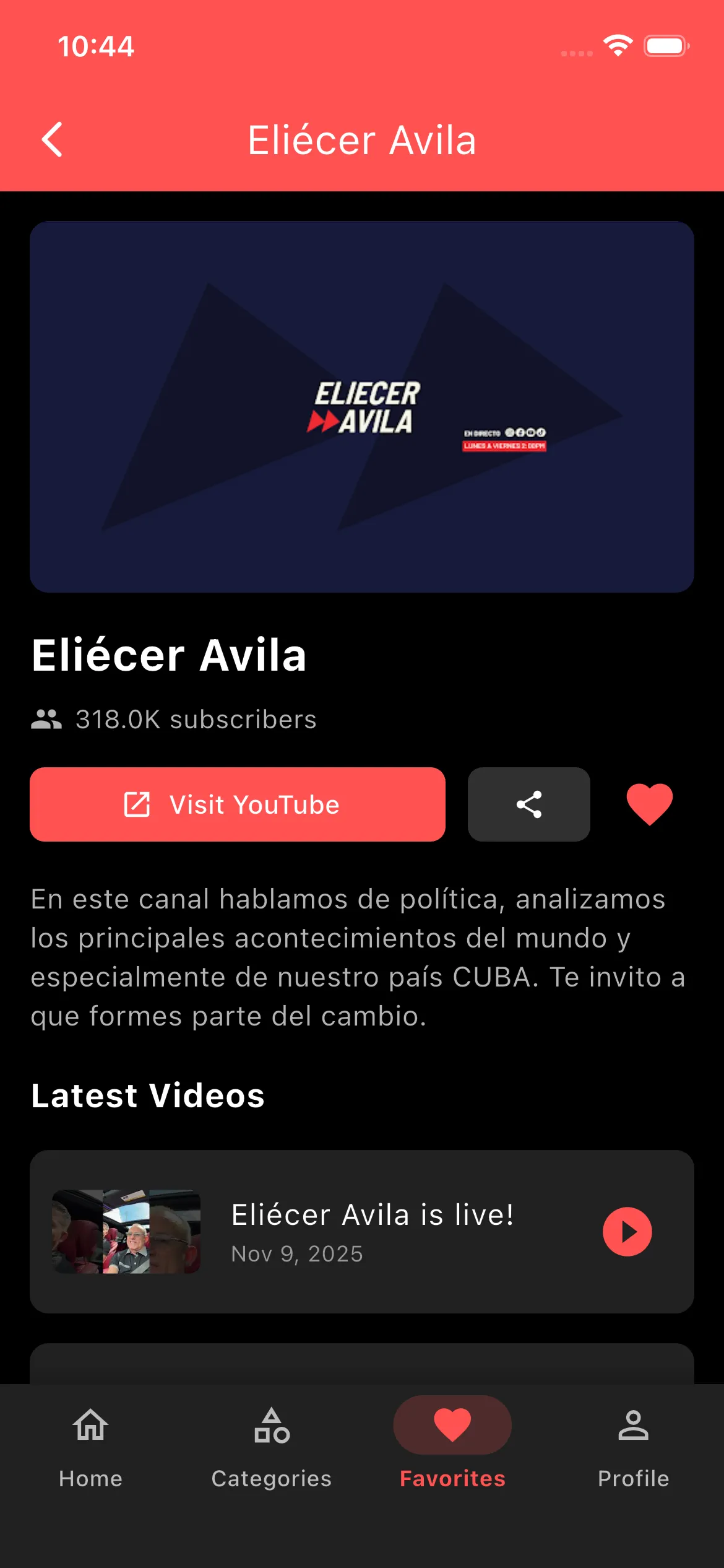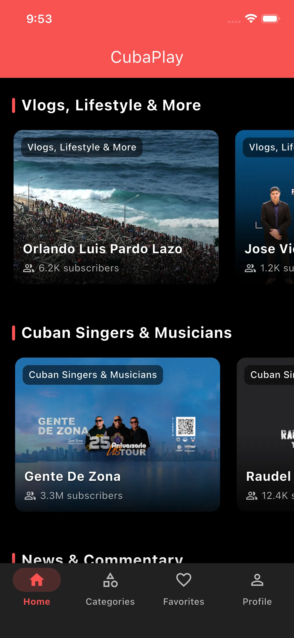 CubaPlay is a unique mobile app created to connect Cubans and fans of Cuban culture around the world. It brings together the most popular Cuban YouTubers and their official channels. Covering music, sports, news, and entertainment. All in one simple platform. We host the largest database of Cuban YouTube channels, featuring over 280 creators and growing every day.